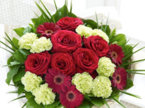 Red Roses, Red Germini, Green Carnations & Palm Leaves
