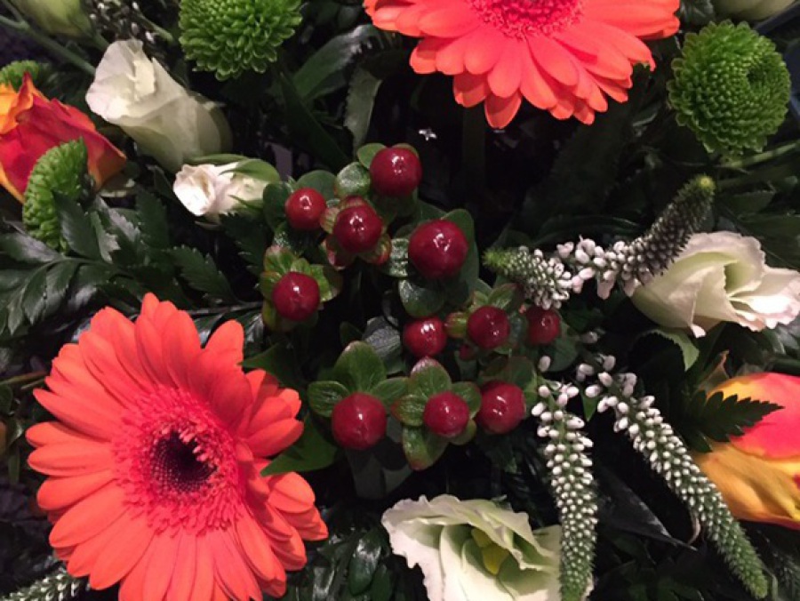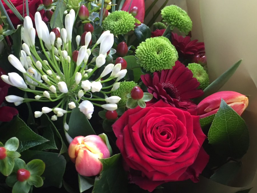 Roses,Agapanthus, Germini,Tullips,Hypericum, Chrysanths & Mixed Christmas Foliage