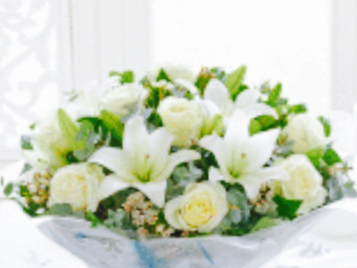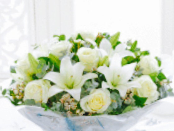 White Roses,Lilies,Wax Flower & Christmas Foliage