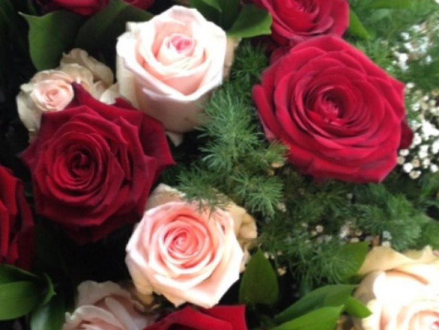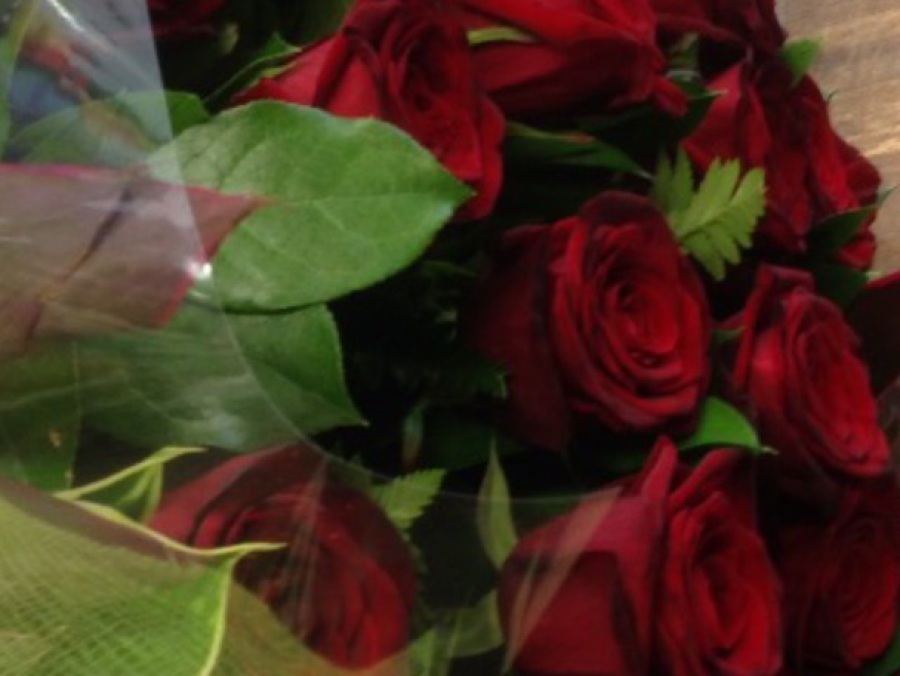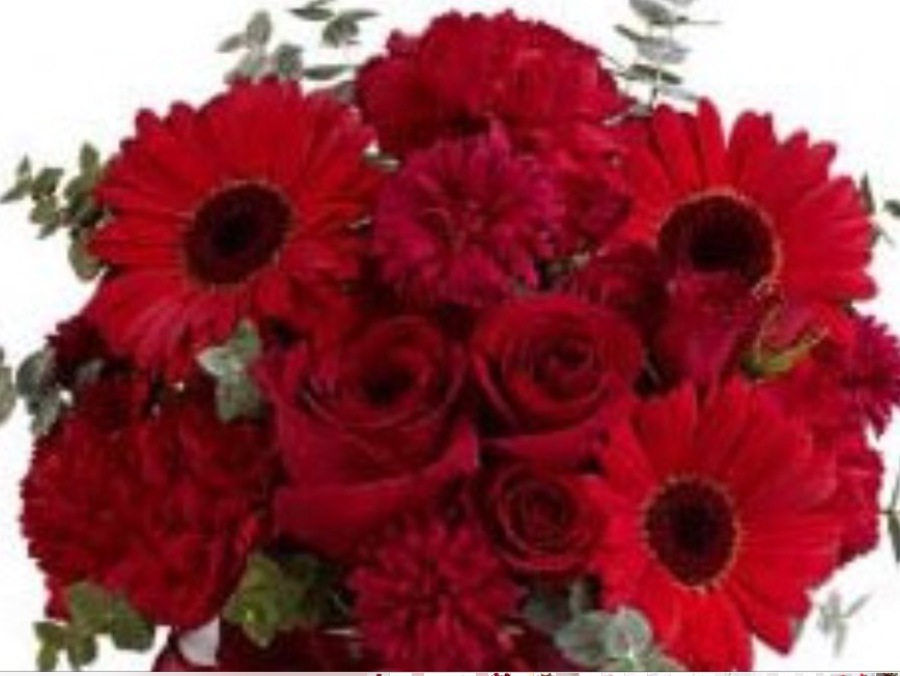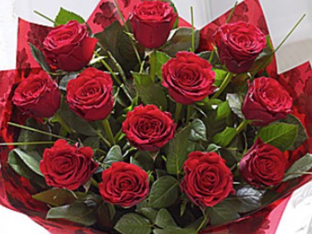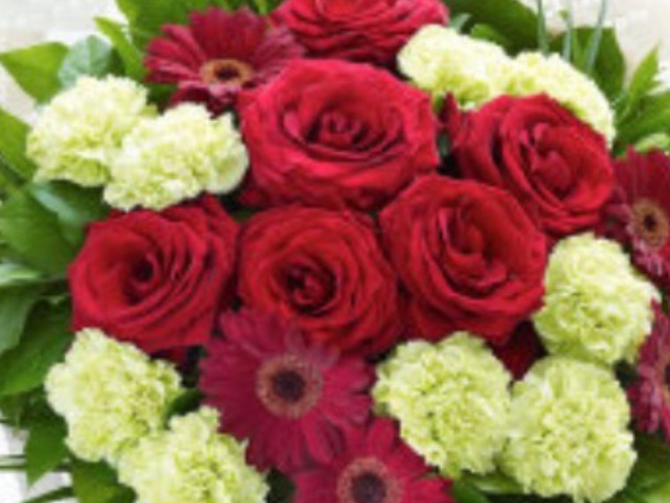 LUCKY SIX: '6' Red Naomi Roses Handtied. JUST BECAUSE: '6' Red Naomi Roses, '6' Red Germini & '9' Green Carnations Handtied. VALENTINES MIX “3” Red Naomi Roses with mixed flower hand tied. ALL RED MIX “3” Red Naomi Roses with Red Gerbera and Red Carnations.
